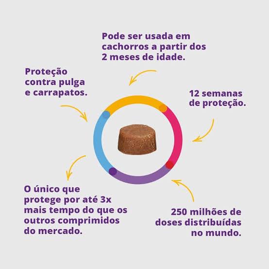Para o tratamento e controle de infestações por carrapatos (Rhipicephalus sanguineus adultos e juvenis) e pulgas (Ctenocephalides felis e Ctenocephalides canis) em cães, proporcionando atividade sistêmica por 12 semanas.