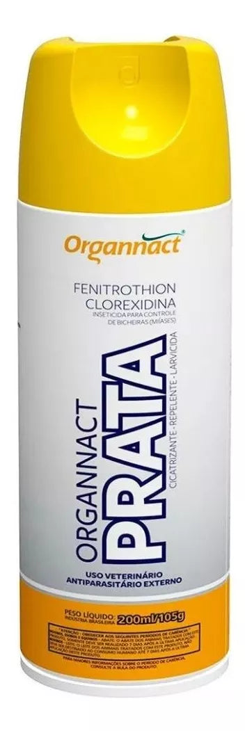 Mata Bicheira e Cicatrizante Organnact Prata CãesSpray em tubo aerossol com 200 mlO Organnact Prata é indicado para profilaxia e tratamento de bicheiras (miíases), causadas por larvas de mosca.